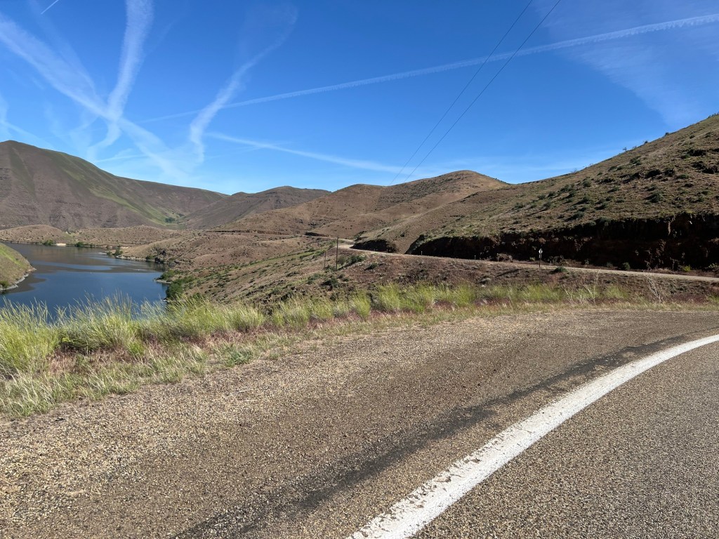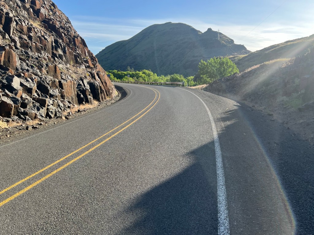 The hard part of the day was going to be the climb out of the Snake River Canyon. I started riding south along the Snake River on the west side (Oregon). It was gently rolling, weaving in and out with the river. At that early of an hour in the morning, the light hitting the hills was stunning.