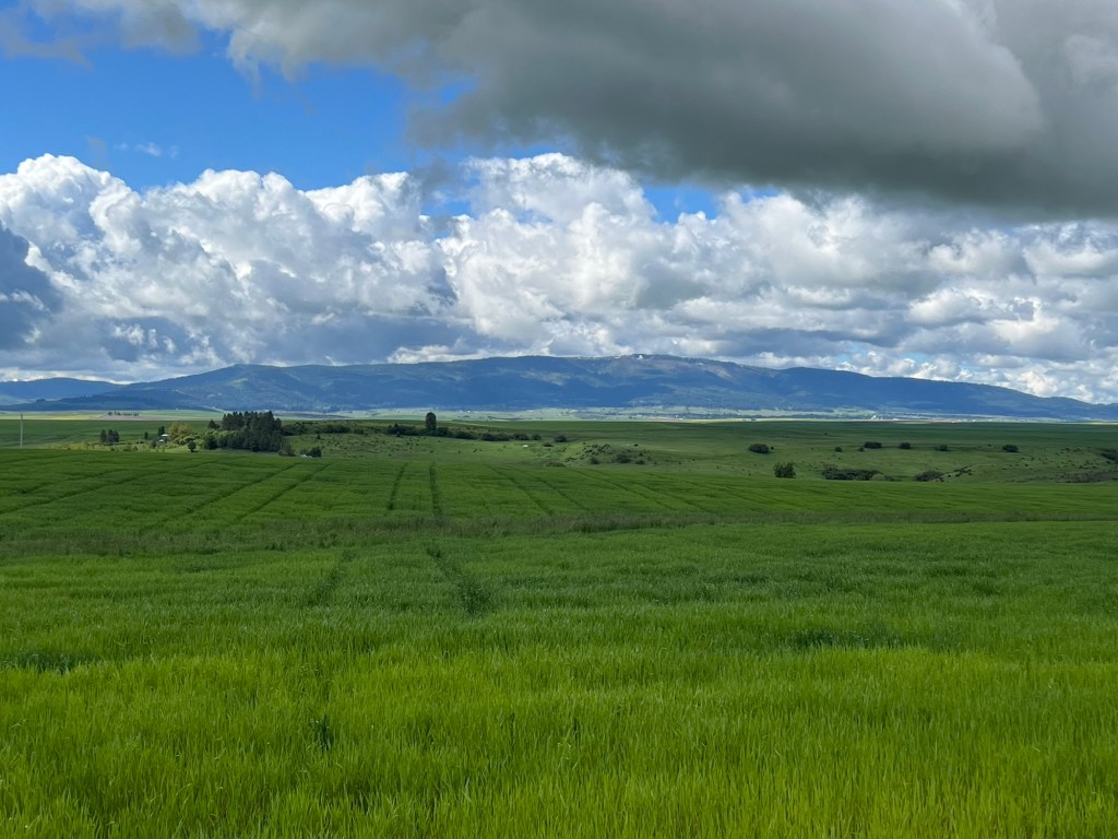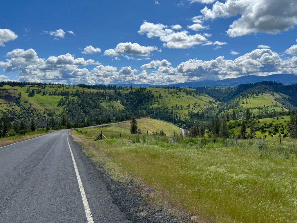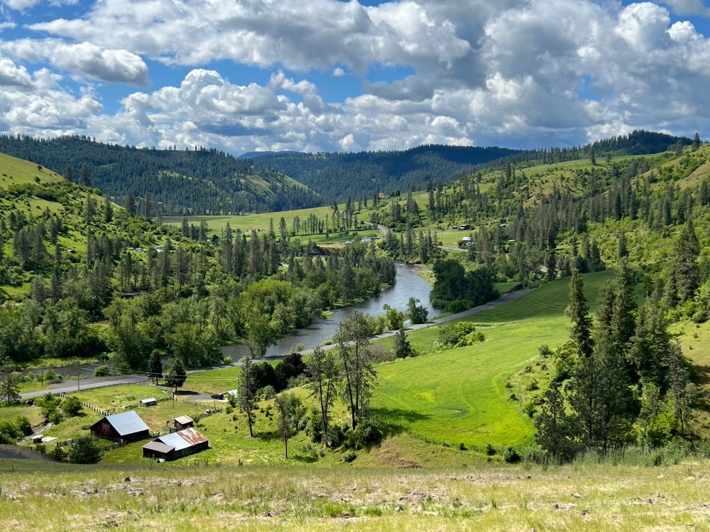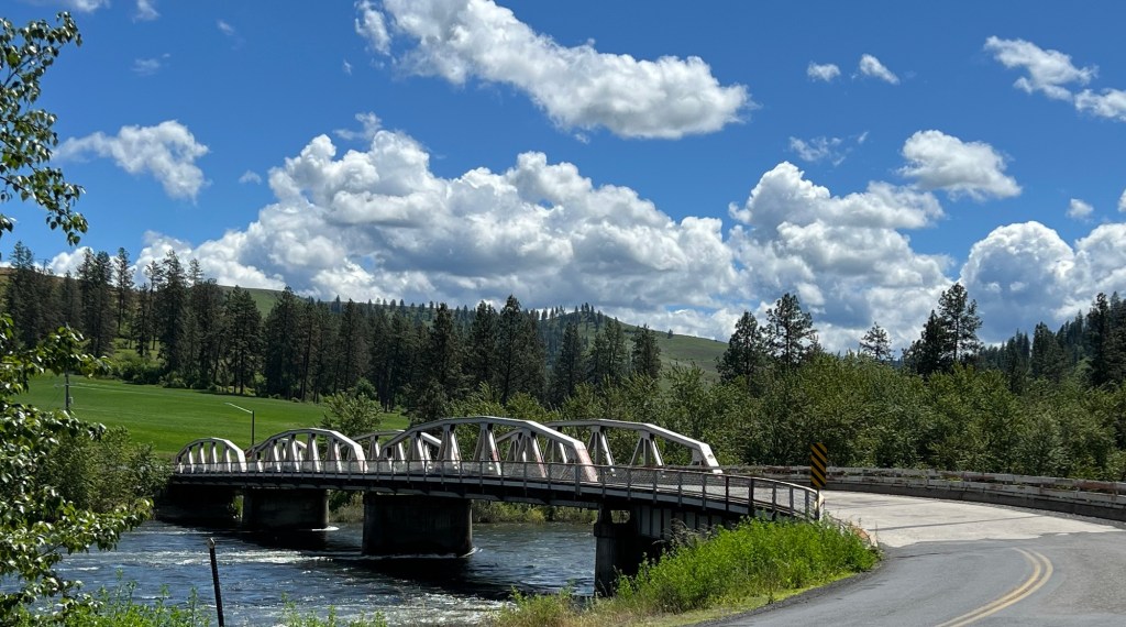 The morning was sunny with big puffy clouds, which added nice shadows to the scenery. The road to Kooskia, Idaho was perfect-country lanes in perfect condition with little to no traffic. This backroads approach took me almost all the way to Kooskia. As opposed to cattle ranches, crop fields stretched for miles on this high plateau. Grangeville and its surrounding environs is at approximately 3,400 feet above sea level.