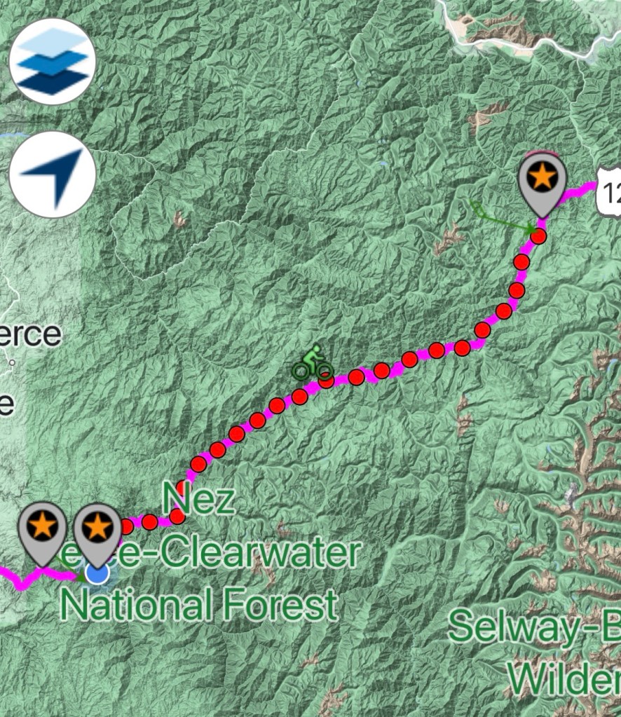To tell you the truth, I have been worried about today’s route for a few days. The combination of length (85 miles) and climbing (4,350 vertical feet) made me wonder if it was too much. Logistically it made sense since it allowed me get through the Nez-Perce Clearwater National Forest in one jump.