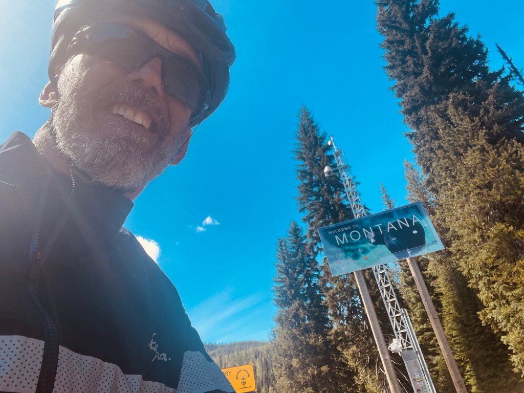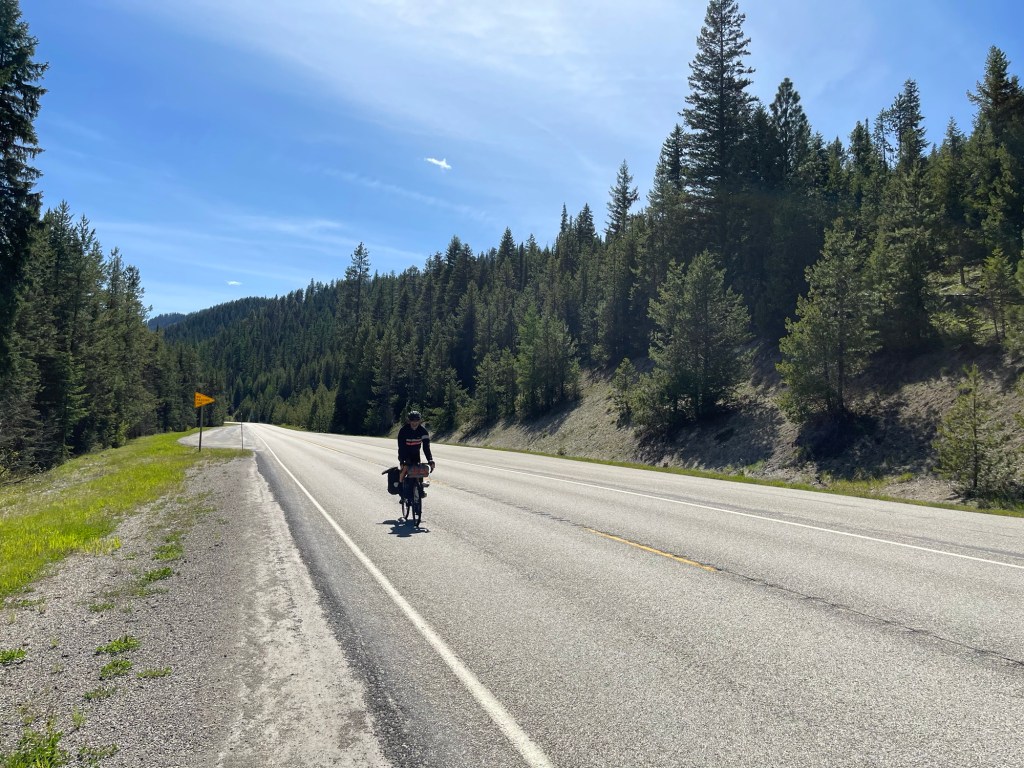 At the end of the 70 mile pleasant uphill section, it was time to tackle the climb over Lolo Pass. It was a constant 5-6% climb, switching back and forth to get over the pass. At the top of the pass is the Montana state border. I can’t say goodbye to Idaho yet because I will be passing through the State on my way south. Unfortunately there was no summit sign so the Montana state border sign will have to do.