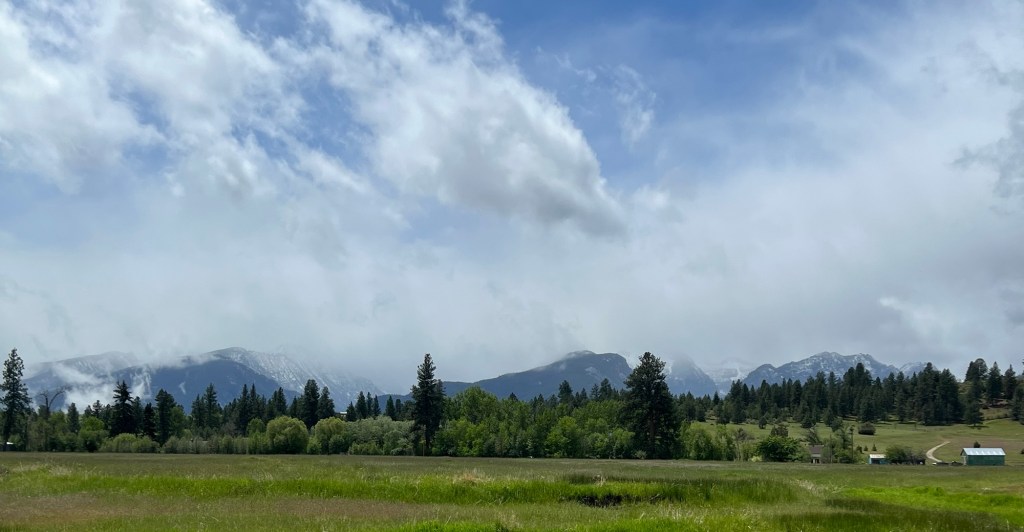 When I talked to the manager of the cabins he told me to pick up food in Darby since there would be nothing to find near the cabins. I dutifully stopped in Darby, picked up a sandwich for lunch and a frozen burrito for dinner (ah the life). While I ate my lunch while on a bench outside the store, hallealuya the clouds parted and the sun came out. This next 25 miles was going to be a piece of cake.