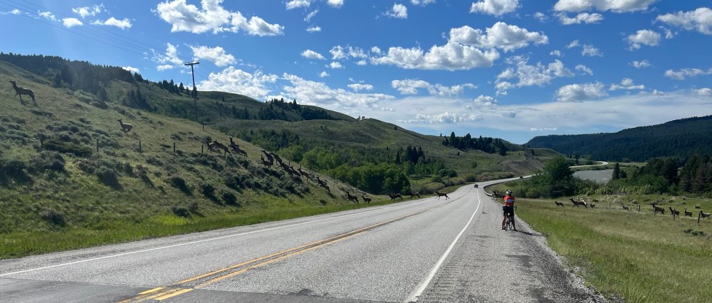 While we were riding, Maggie called out and all of a sudden a herd of elk charged across the road in front of us (thank you to Bruce McCrindle for identifying them since I don’t know the difference between an elk and a squirrel). I almost trashed the bike trying to get a picture, but I attached one below (you have to expand to get a good view).