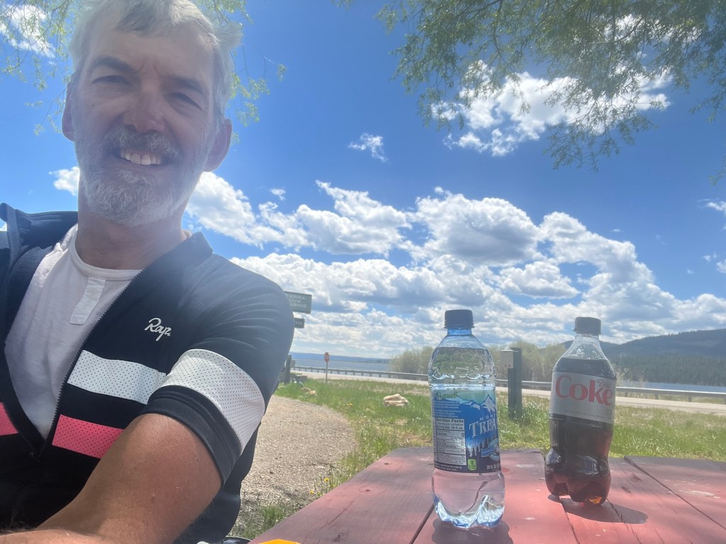 As I was contemplating who on the roadside I would eventually have to beg for food, a small convenience store appeared. It had picnic tables by Lake Hebgen and some great locally made sandwiches. Crisis averted.