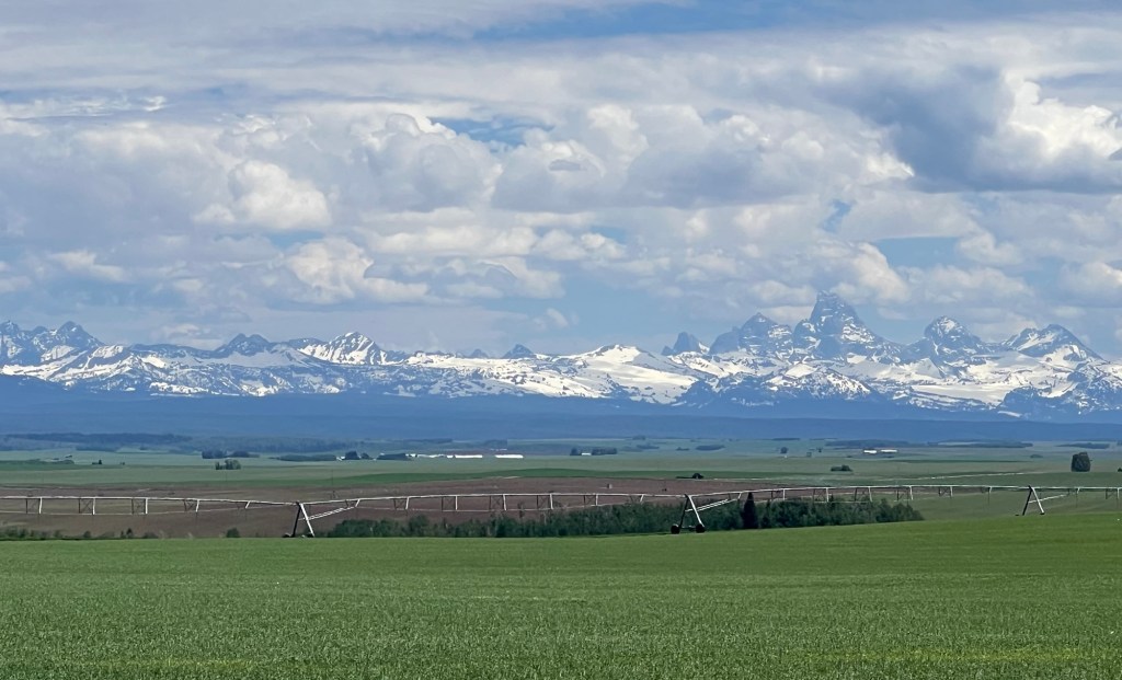 After the Falls, there were a couple of short but steep climbs that took me to a high plateau. I have been accustomed to seeing cattle ranches so I was surprised to see large farms. It appears that barley and wheat are the two main crops, and the fields seem to stretch forever with the mountains in the background.