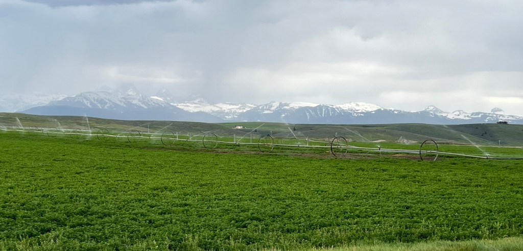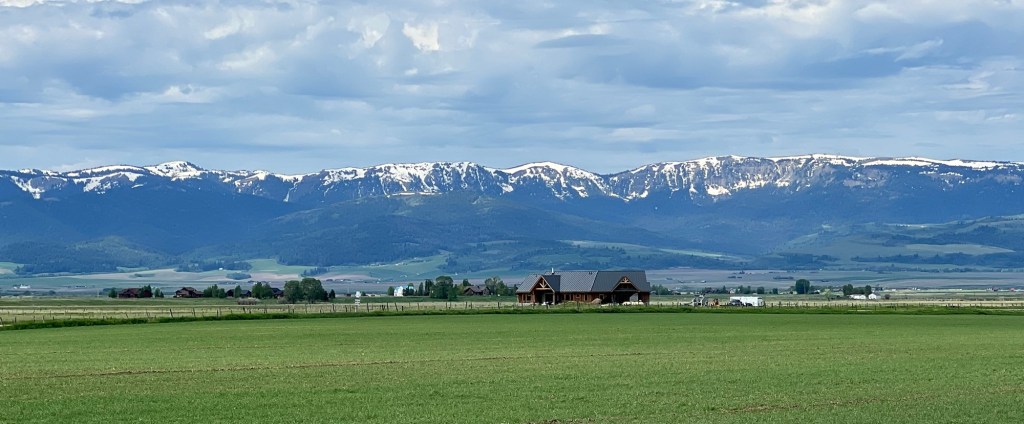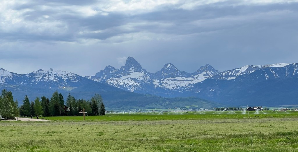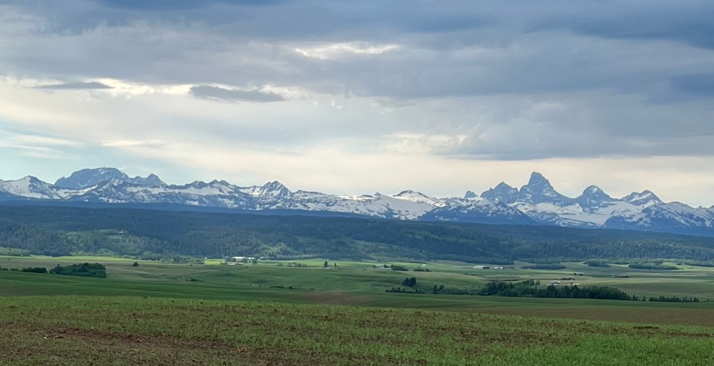 In the beginning, as was true with the scenery at the end of yesterday’s ride, I pedaled through farmland. As the morning progressed, however, the Teton Range loomed into view. I had never seen the Tetons from the west side, but they are truly impressive whichever way you see them.