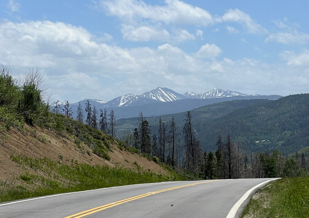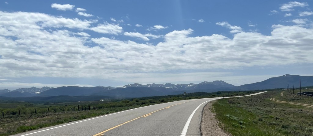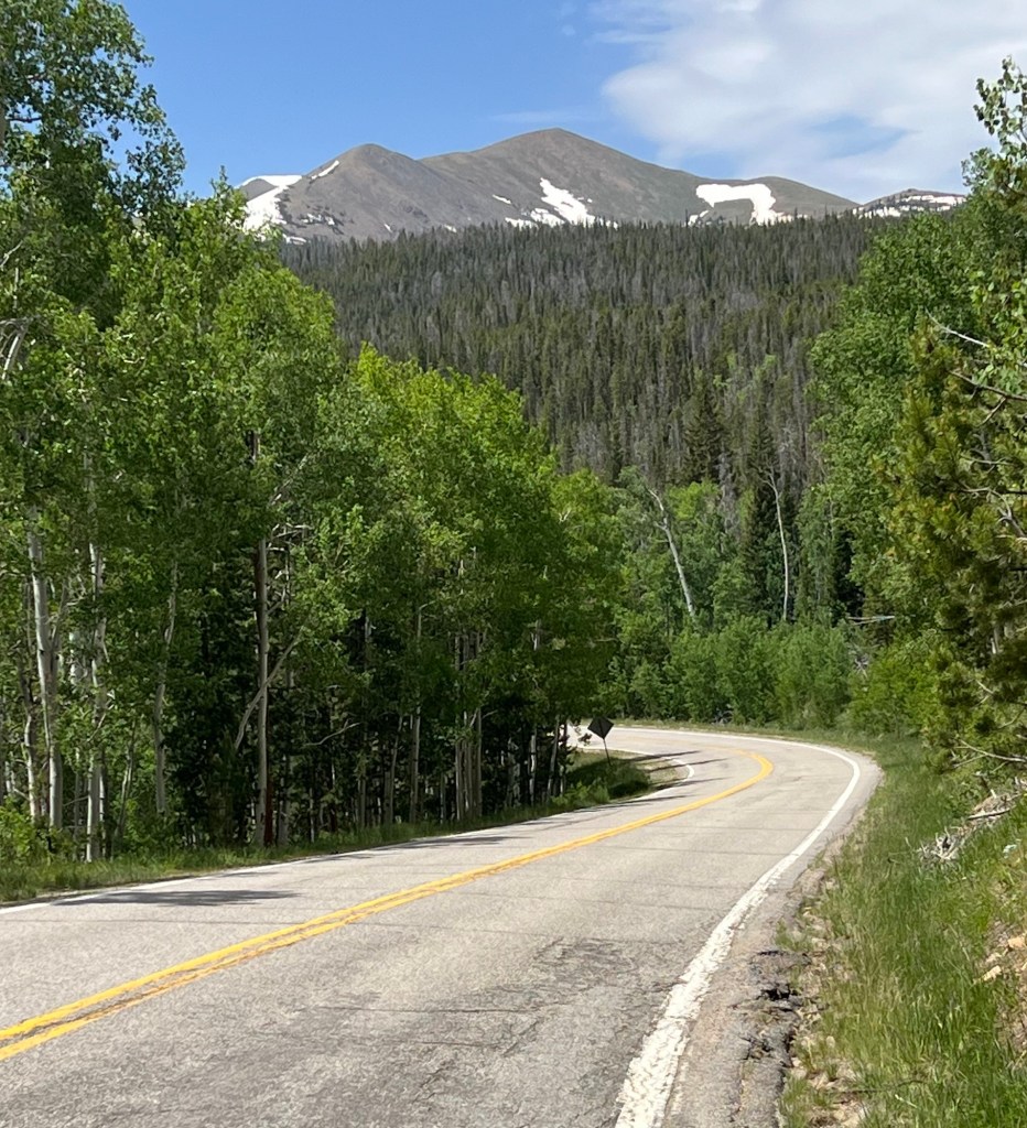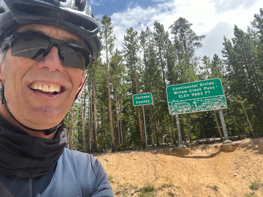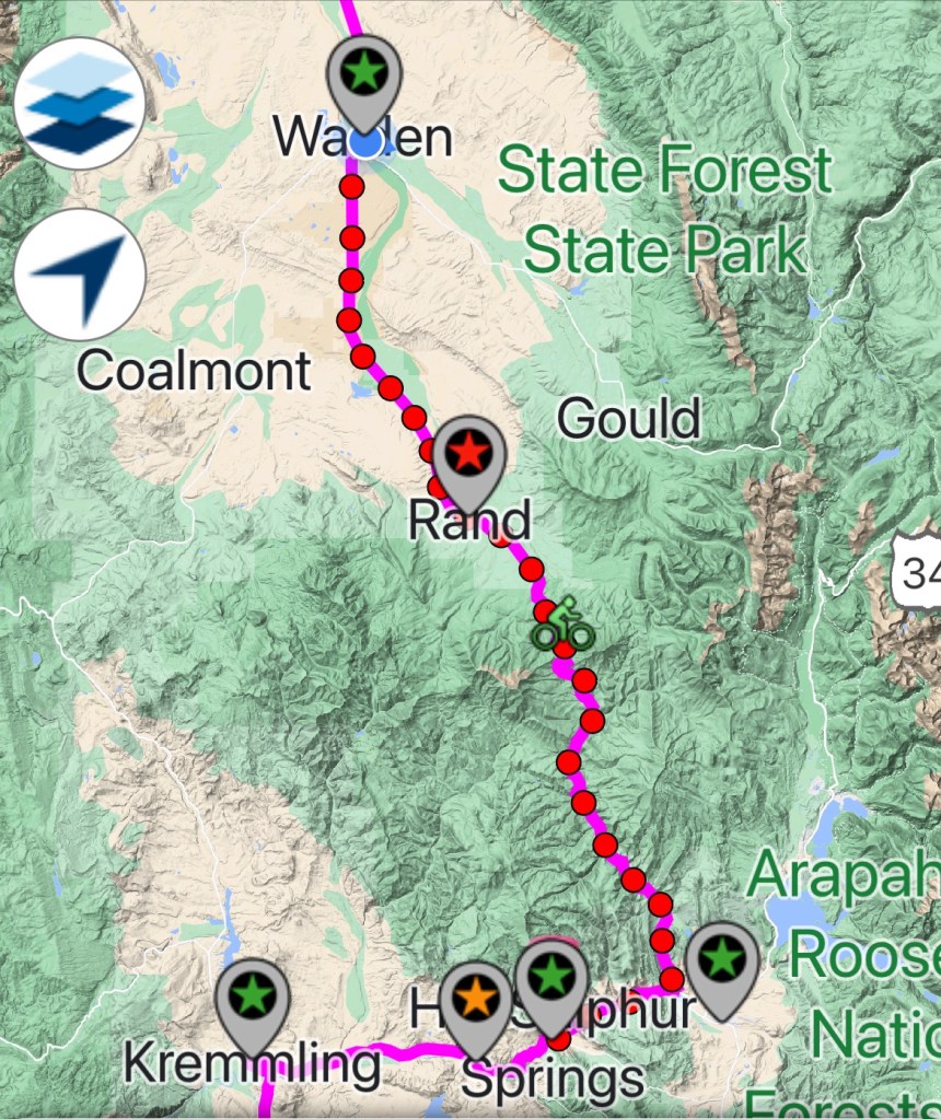 Today’s 60-mile route again went south and a little east, until jogging west for the last six miles. When you look at an elevation map of the ride, it appears as a symmetrical pyramid-30 miles up over the Willow Creek Pass/Continental Divide and then 30 miles down to my final destination of Hot Sulphur Springs, Colorado.