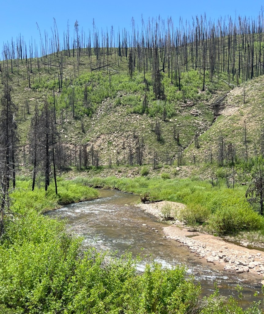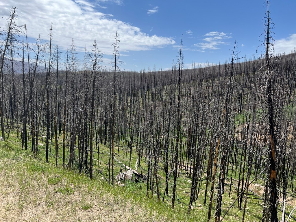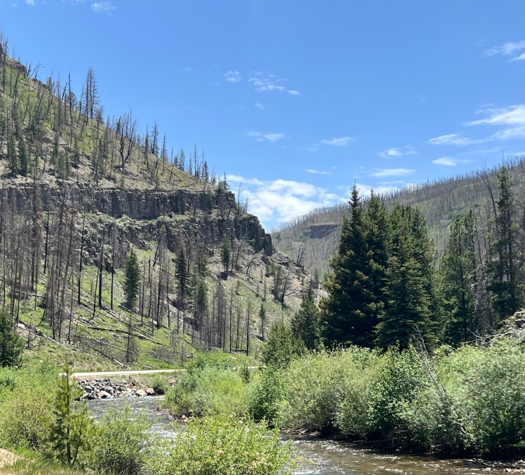 Once over the top, the road descended for 30 miles, none of it too steep so that I could let the brakes go and relax. Unfortunately, on this side of the pass almost all of the trees are burnt and charred as a result of a large forest fire in 2020. New growth is emerging but it has a long way to go. Indications of the fire were apparent for about 20 miles of my descent.