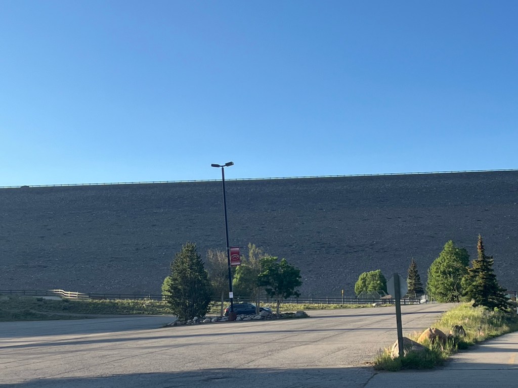 View of dam wall from Silverthorne bike path. For perspective of size of wall, note car on the top far left of the wall.