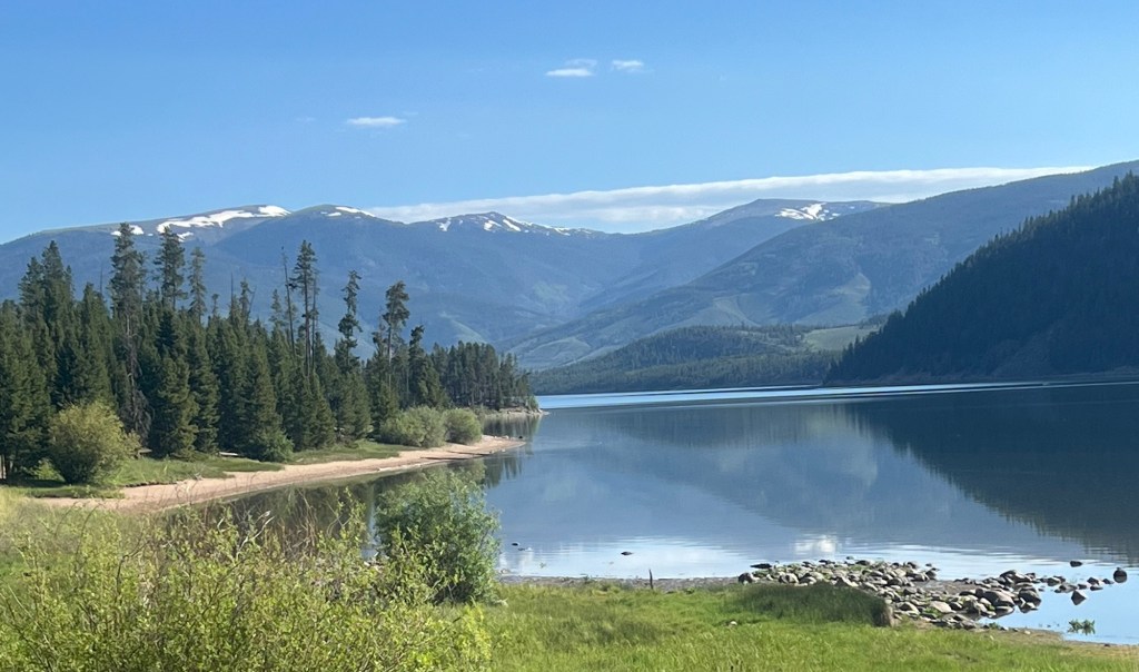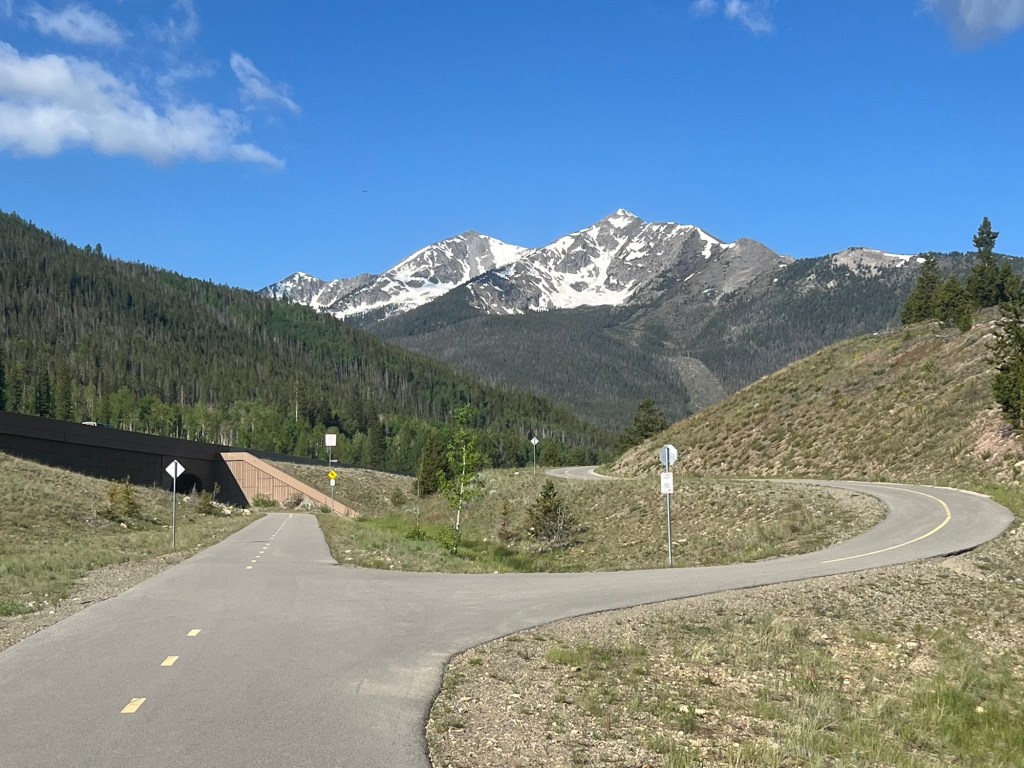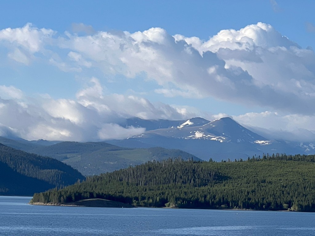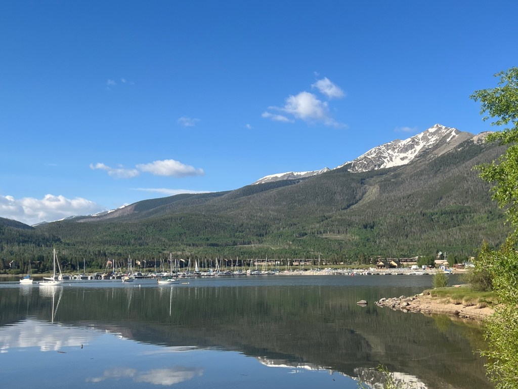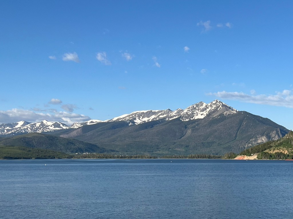 I immediately got on the bike path and headed south. The bike path was perfect. It began with tight switchbacks out of Silverthorne to a path along another huge reservoir, Dillon Reservoir. When standing in Silverthorne, the wall of the reservoir looms over the town.