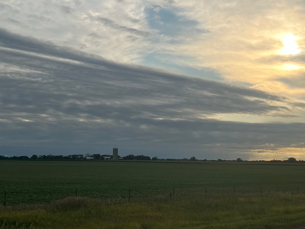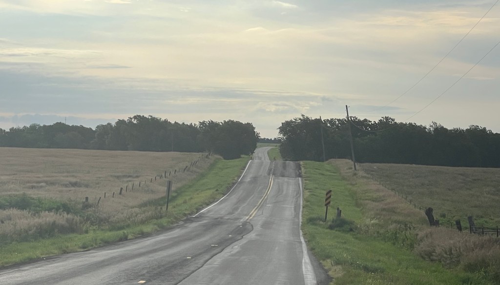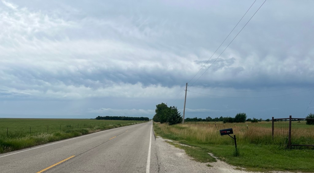 During this section, I stopped briefly to talk to another bike traveler going in the opposite direction. We jointly commiserated about the traffic, and he said he was not feeling the love from Kansas drivers. He was thankful for his tailwind (I almost cried when he said that), and had only started his dayās ride at noon. Even though we were off the road, we parted ways after having various pickup trucks honk at us.