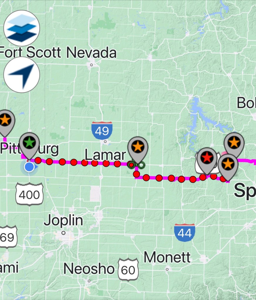 After leaving Kansas, I stopped to have a snack. As I was eating, the first eastward rider came up to me. His name is Daniel and he was from Switzerland. His route started in San Francisco and then he picked up my route in Pueblo, Colorado. In a few miles, he was going to take Route 66 up to St Louis and then end up in Philadelphia. He was 65 years old and had last visited the States about 40 years ago.