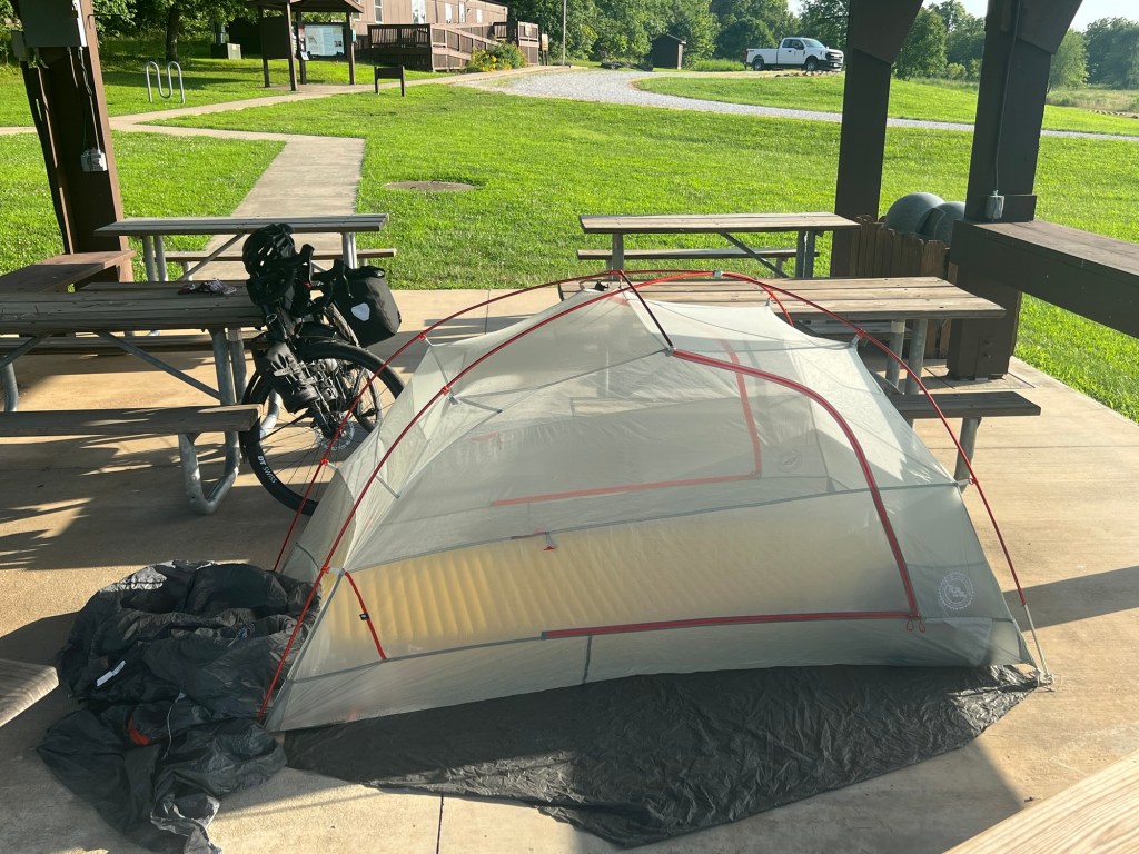 It was too hot to set up my tent, so I waited until 8:00 pm. It is supposed to rain tonight so I ended up setting up my tent on the cement under the pavilion. I don’t think I will get much sleep tonight but tomorrow is only a 45 mile ride with a Holiday Inn at the end of it. I need to get done before the heat picks up again.