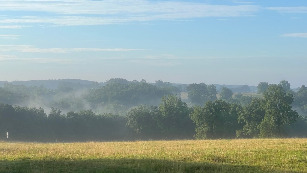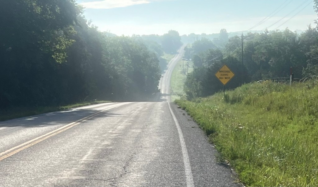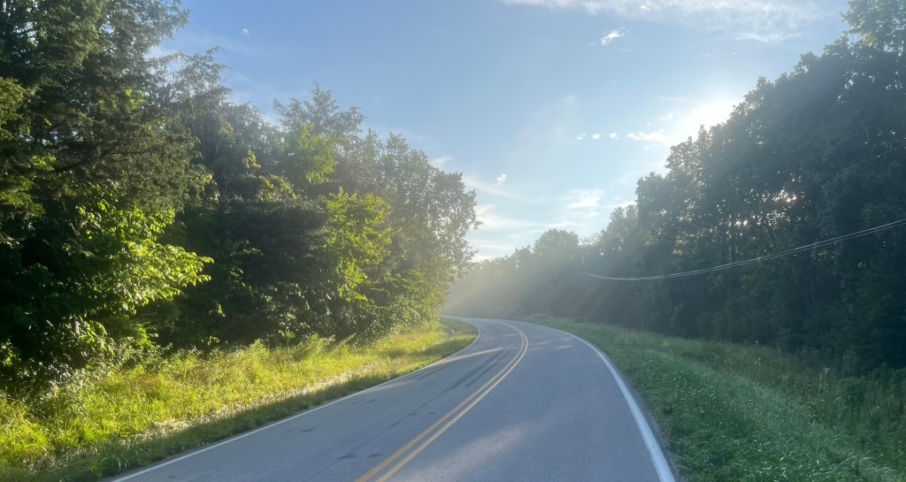 The fog gave some drama to the hills along the road. Although climbing the hills is tough, the landscape is picturesque. The green hills and trees look rich and lush, a stark difference from the flat plains of Kansas.