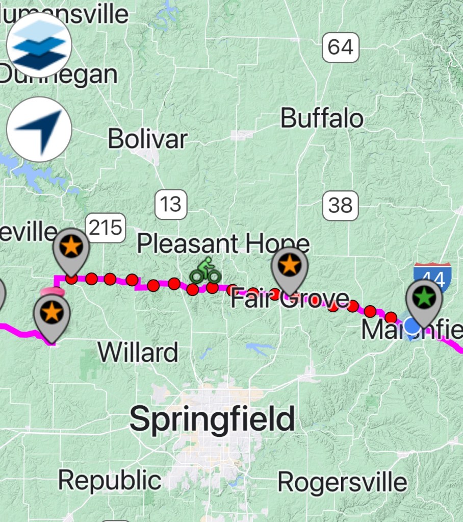 I started to pack up the tent at 4:00 am so that I could hit the road early again. Thankfully the planned route was short, only about 40 miles and was going to end at a hotel in Marshfield, Missouri.