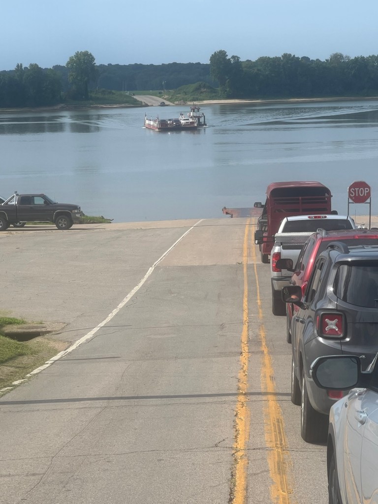 I arrived at the ferry at about 8:30 am and waited in line to board. When the ferry arrived, I got on last since I would also be the last off. As we were crossing the river, the ferry captain yelled to me that there was a couple on a tandem about one hour ahead of me. I told him it was too hot for me to catch them (an acceptable excuse). The entire ferry trip took only about 15 to 20 minutes.