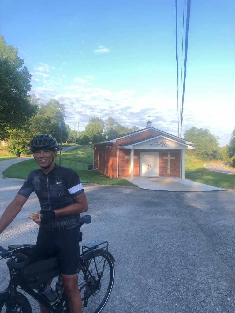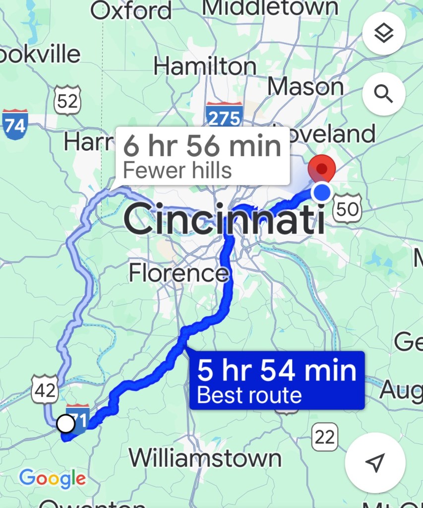 After a nice dinner last night in Warsaw, Kentucky, about seven miles from Sparta, where we stayed, Paul and I drove the first 30 miles of today’s course. The reason we did this is that I would not be using any of the route designed by Adventure Cycling, but navigating purely on directions provided by Google Maps. If I used Adventure Cycling’s route to Milford, Ohio, the route would be 157 miles. If I used the route provided by Google Maps, the route would be 65 miles, but with more traffic and hills. At this point, it was a difference of one or two days to get there, and with Paul still pulling domestique duties and carrying my bags, the shorter route made sense.