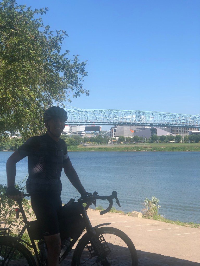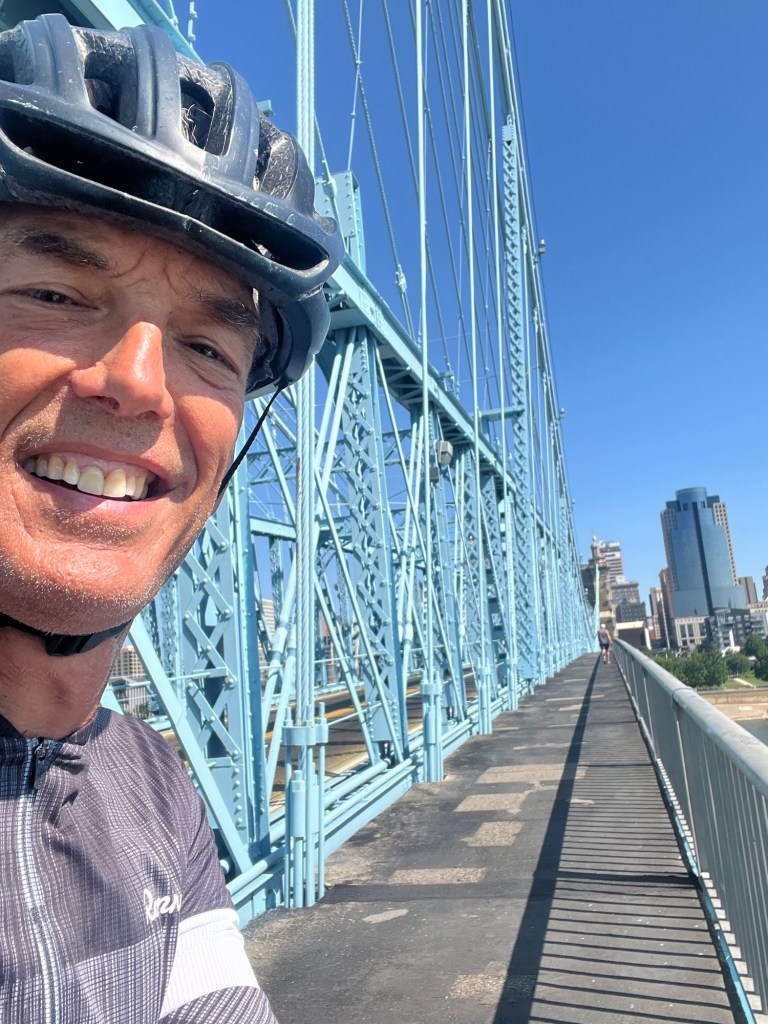 The route took us to the riverfront with a nice view of Cincinnati across the Ohio River. My route would lead me across a bike/pedestrian path across a suspension bridge across the Ohio River while Paul would drive over. We decided to meet at a park that was next to Great American Ball Park, where the Cincinnati Reds play.