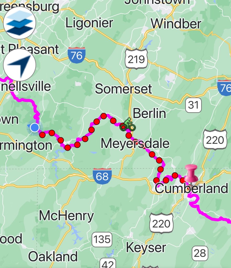 The trail took me into my final destination in Cumberland, Maryland. The GAP ends in Cumberland. Fortunately, as I was pulling off the trail to find my hotel, I met Ed. Ed was a volunteer who was watering the flowers along the trail. He was a retired teacher from Bethesda, Maryland who returned to his home town and served as downtown Cumberland manager for a time. He told me of the city’s efforts to rebuild, capitalizing on its location as the terminus of the GAP and the C&O Canal Bike Trail. He said that since COVID and the advent of young people working wherever they wanted, many were electing to relocate to Cumberland to take advantage of the outdoors. He stated that for the first time in years the population in the city has increased.