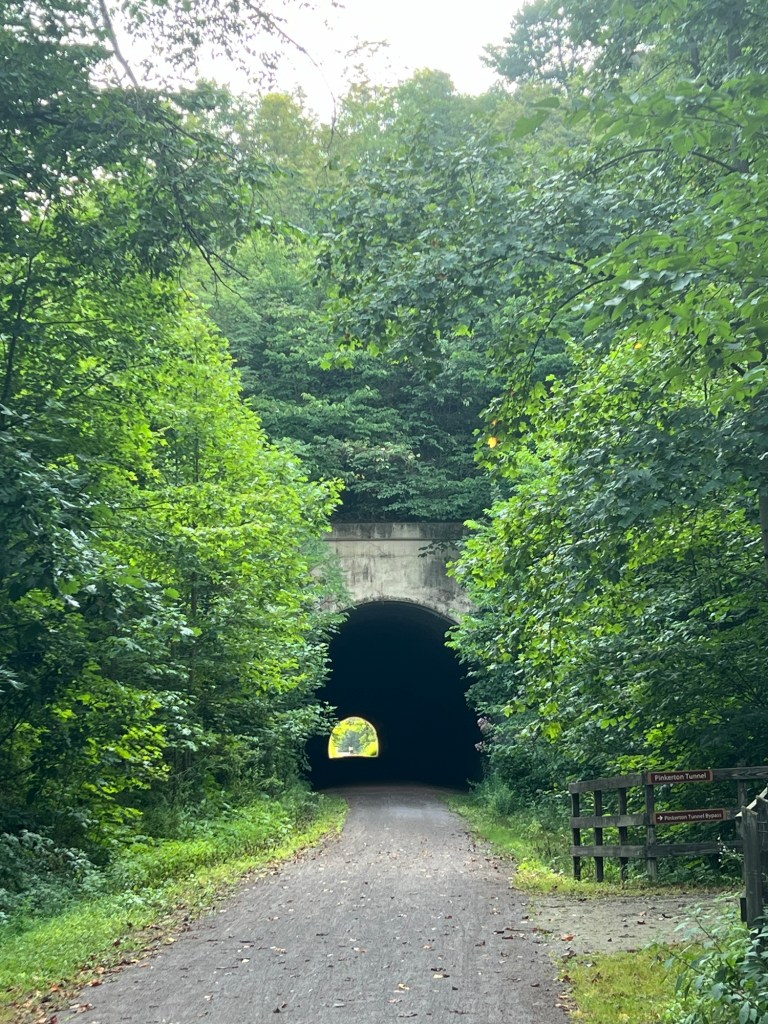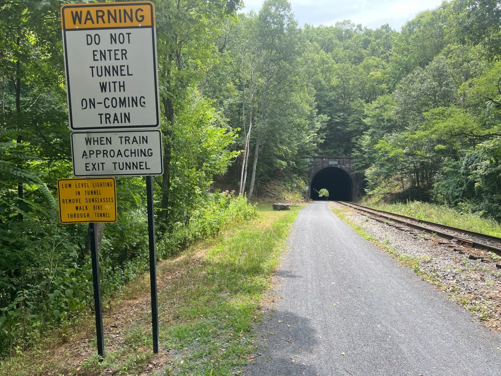 At about the 50 mile mark, I arrived at the Eastern Continental Divide. The climb was so gradual it was hard to beleive that I was at 3,000 feet. Once I stopped for some pictures, it was time to cruise down a 25 mile descent. I am glad I came at the divide from the west because the eastern side was steeper, allowing me to either pedal or not. The trail was filled with more bridges and tunnels, including the Big Savage Tunnel, which is 3,300 feet long. It was so long I needed to turn on my headlight to make sure I could get through. It was great fun.